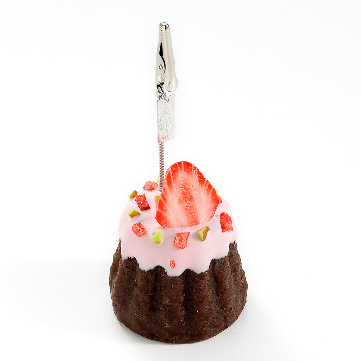【 職人メッセージ 】 フランス菓子カヌレを、いちごづくしのデザインでクリップにしました。 いちごチョコにドライいちごとカットいちごをのせた、まさに“いちごまみれ”の一品。 チョコの垂れ方は職人が手作業で仕上げているため、一つひとつ微妙に異なる表情を楽しめます。