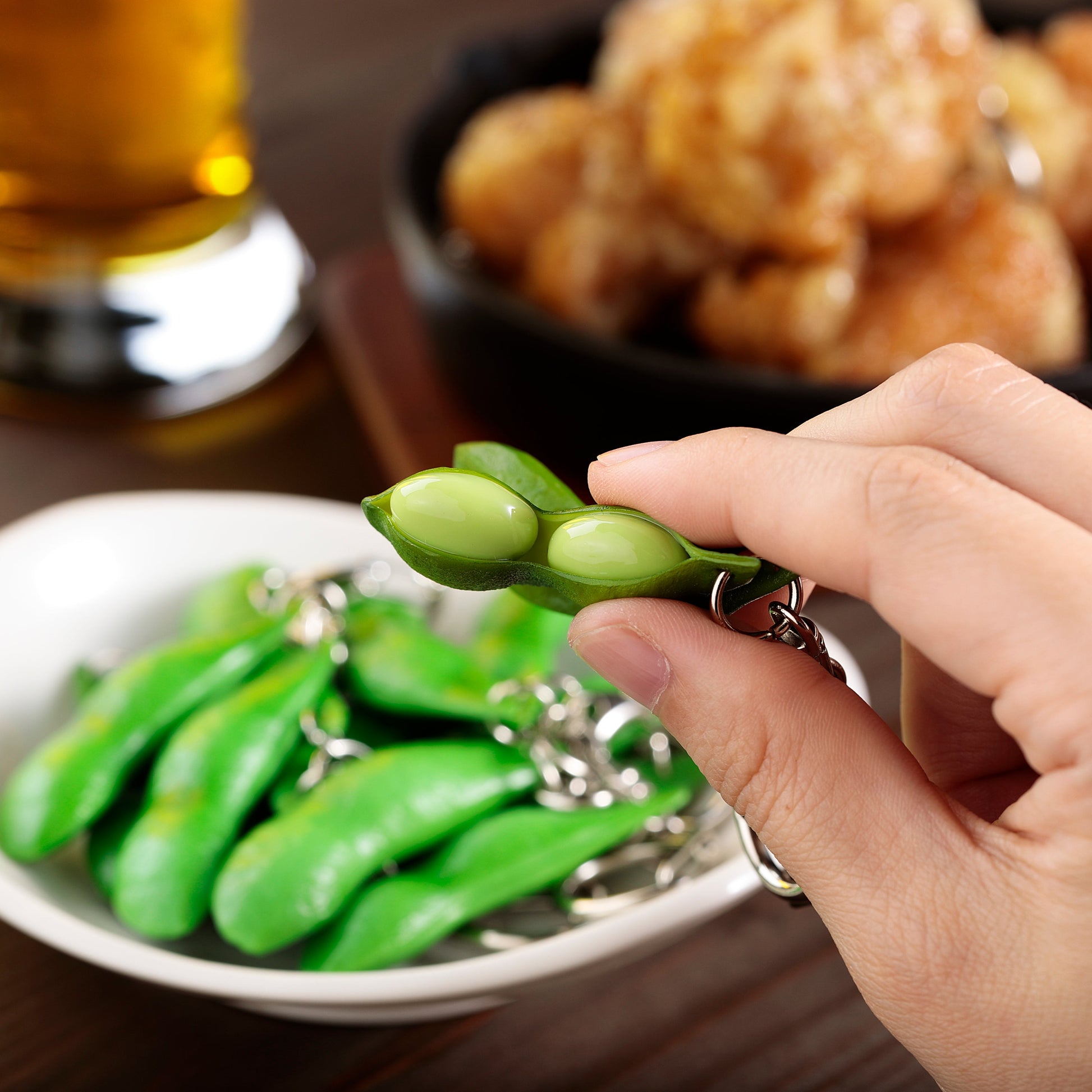 普通の枝豆と違い薄皮の色が濃く、この色を表現するために一つは中身が半分出ている形にしました。