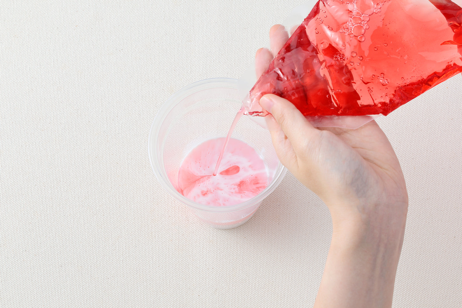 2種類のジュースパックを混ぜて、お好みの色を作れます。